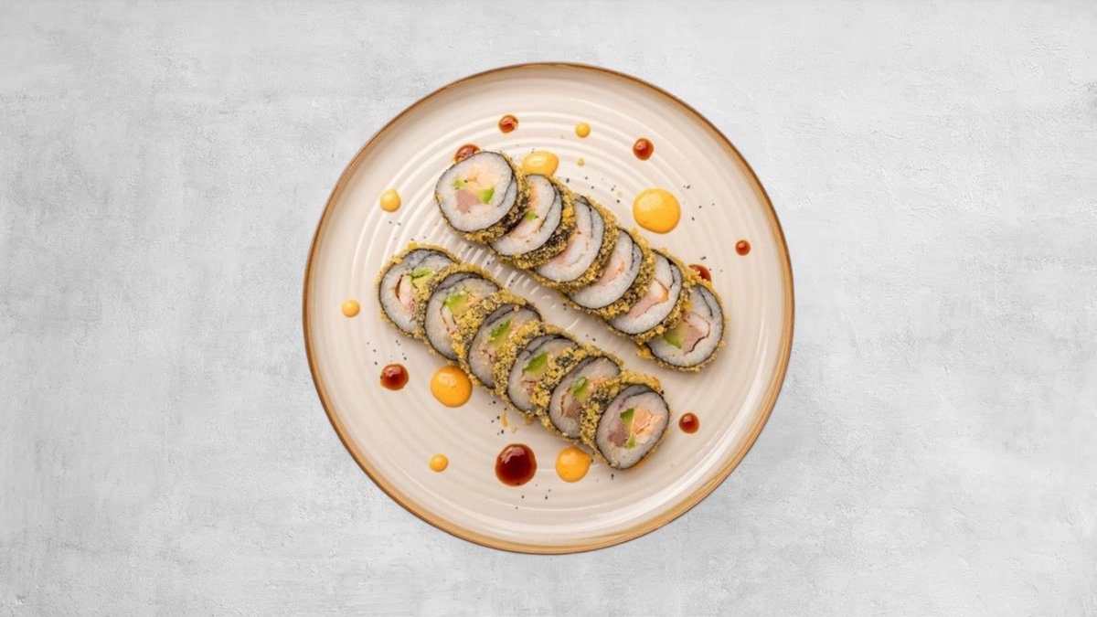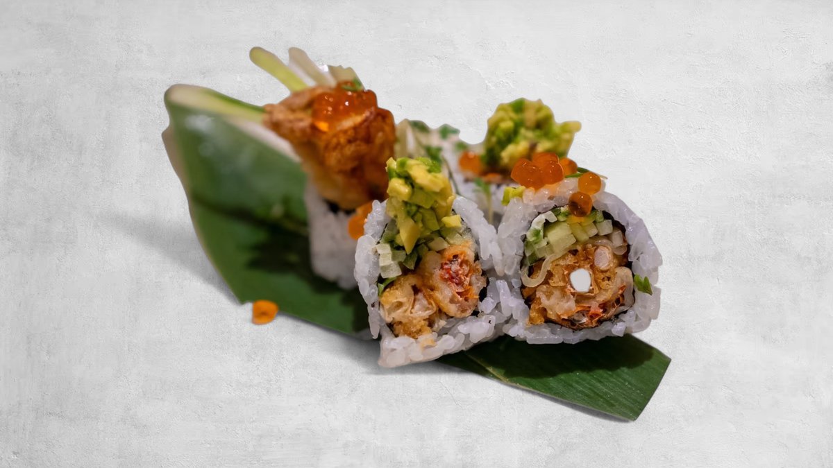 futomaki tempura roll 12 ks (losos, avokádo, okurka, chilli mayo, krabí tyčinka, smažené v tempuře, polité 2druhy omáček, řeřicha)