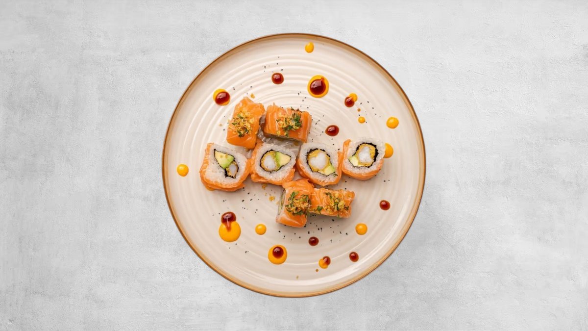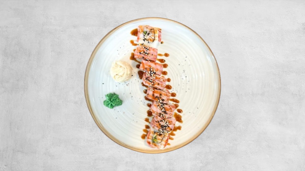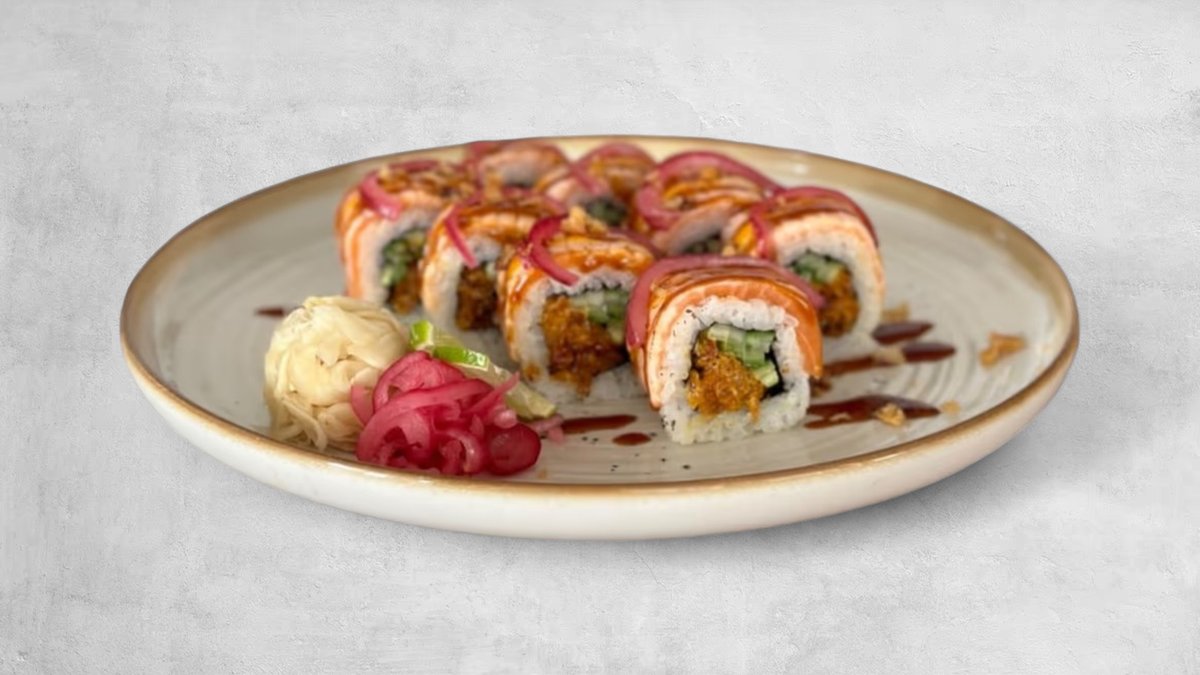 uvnitř: Krevety Tempura,Okurka,Krabí Krém Vně: Avocado,losos,pinky sauce ,snow sauce,tempura sypání