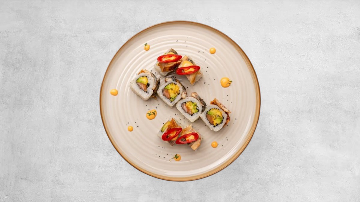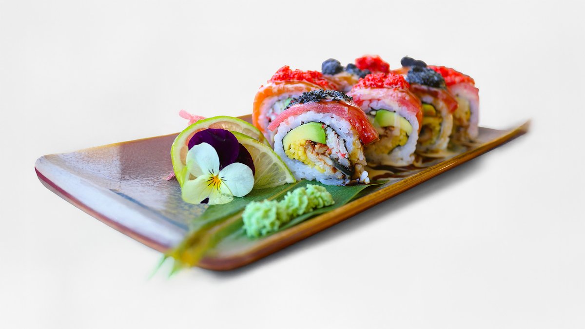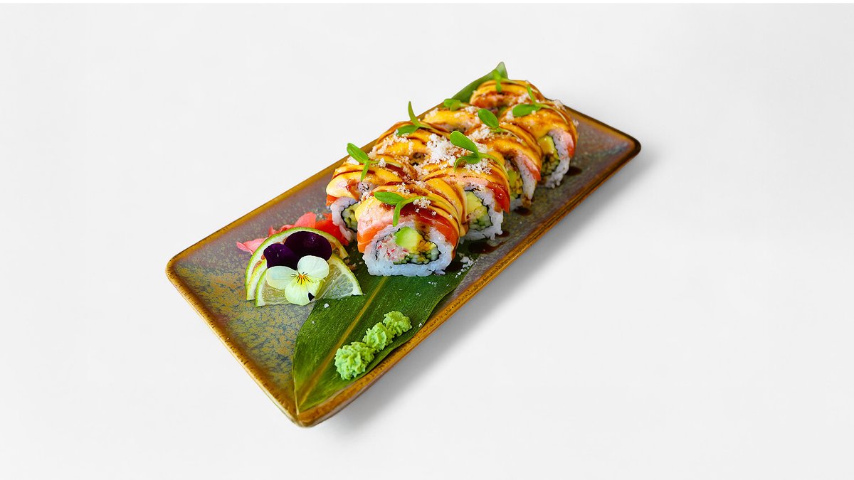 uvnitř : BBQ úhoř ,krabí krém,avokádo,mango vně : tunak,losos,sněhová omáčka, teriyaki omáčka,kaviar