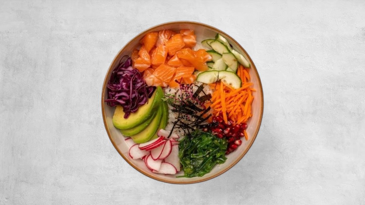 rýže, červené zelí nakládané, okurka, wakame, avokádo mrkev, edamame, granátové jablko, sezam, řeřicha. Nori a maso či tofu dle výběru (losos, tuňák, krevety restované, kuře tempura, tofu)