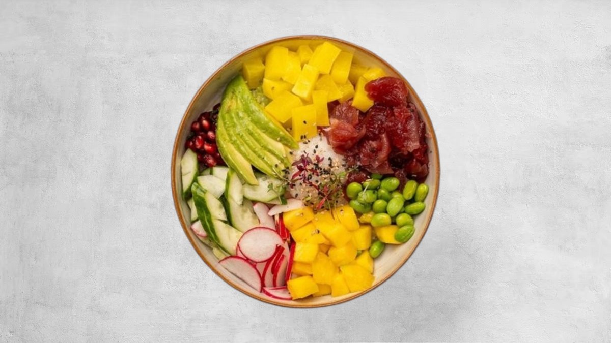 rýže, mango, avokádo, granátové jablko, edamame, ředkev žlutá, ředkev kulatá, wakame, sezam, řeřicha, smažené panko a maso či tofu dle výběru (losos, tuňák, krevety restované, kuře tempura, tofu)