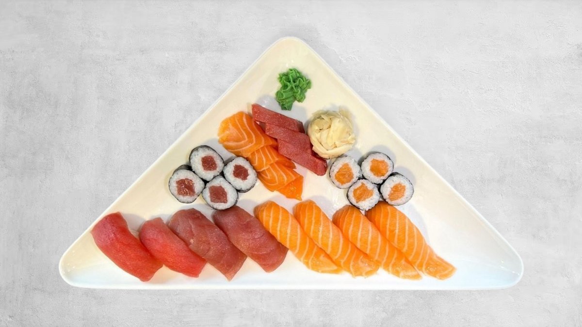 4ks nigiri losos, 4ks nigiri tuňák, 4ks maki tuňák, 4ks maki losos, sashimi (3 losos, 3 tuňák)