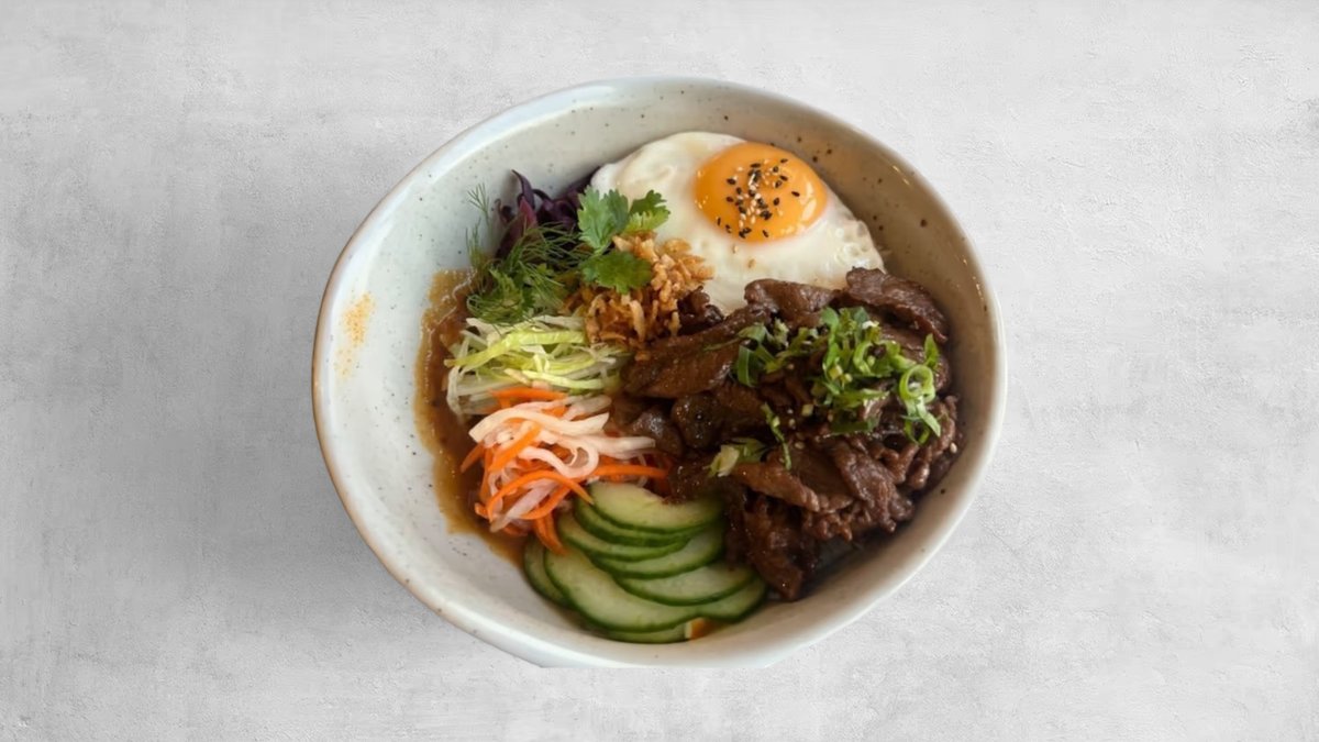 speciální miska s jasmínovou rýží, nakládanou a čerstvou zeleninou, jemnou givězí roštěnou, sazeným vejcem a signature dresinkem