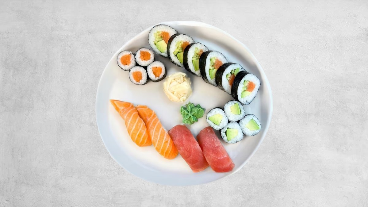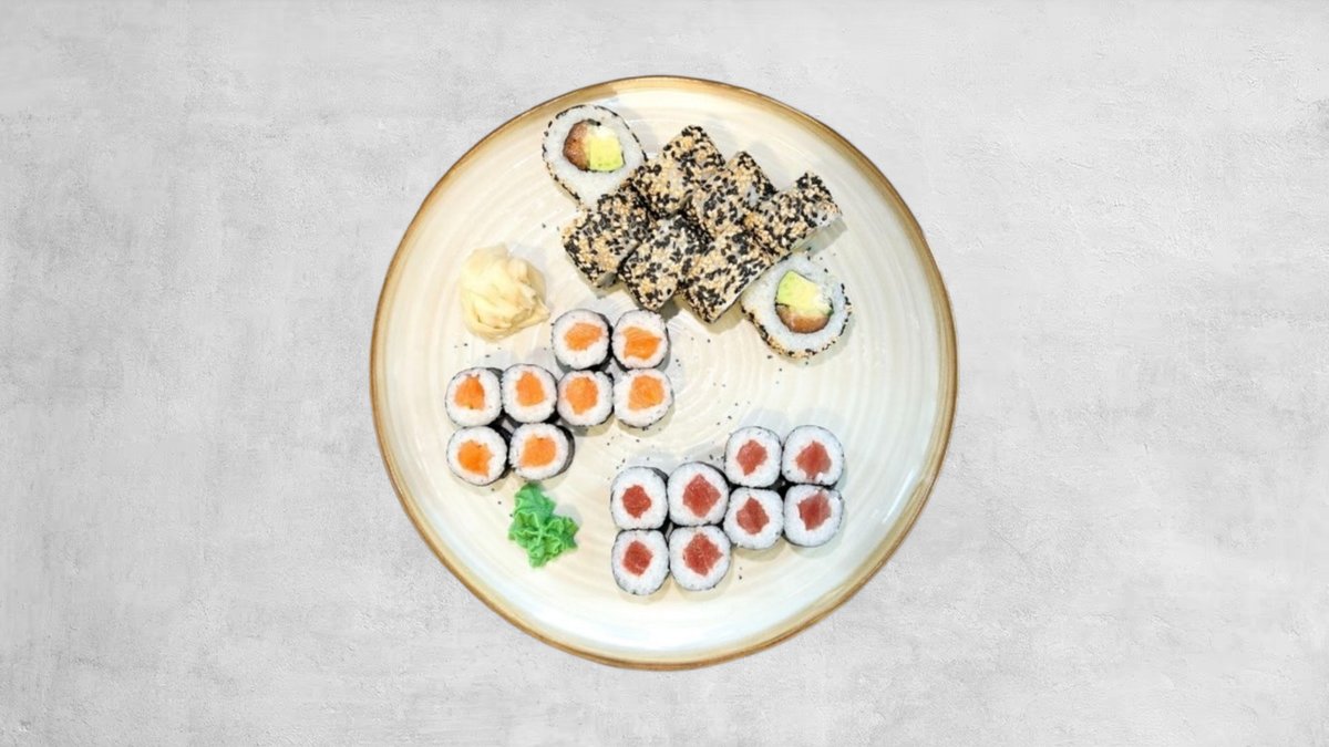 6ks Futomaki Sakura Roll, 4ks maki losos, 4ks maki avokádo, 2ks nigiri losos, 2ks nigiri tuňák