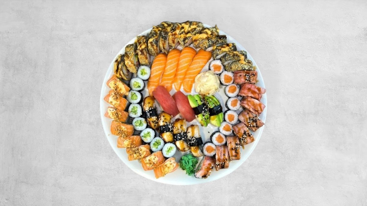 12ks Futomaki tempura roll (Extreme Roll), 8ks Sunset Roll, 8ks Fire Skin Roll, 8ks maki losos, 8ks maki okurka, 4ks nigiri unagi, 4ks nigiri losos, 2ks nigiri tuňák, 2ks nigiri avokádo