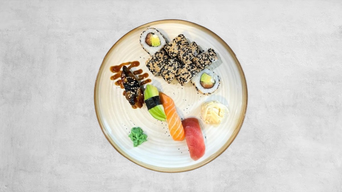 8ks California California Sesame Sensation Roll, 1ks nigiri losos, 1ks nigiri tuňak, 1ks nigiri úhoř, 1ks nigiri avokádo
