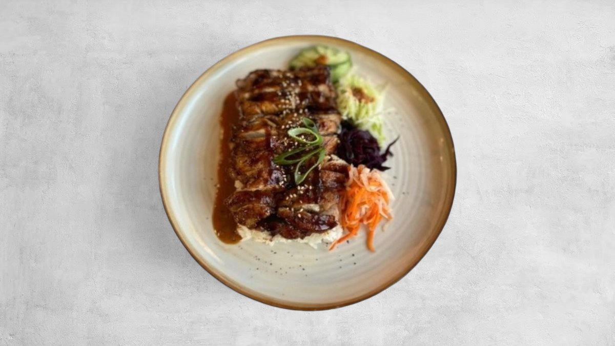 vykostěné kuřecí stehno v japonské omáčce Teriyaki s čerstvou a nakládanou zeleninou, jasmínovou rýží a signature Atari dresink