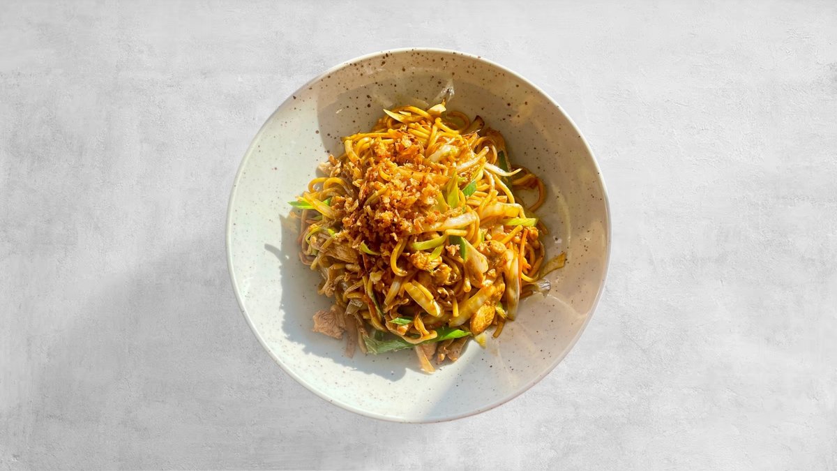 Smažené nudle s kuřecí masem,mrkev,porek,čínský zelí,cibule,smažené cibule
