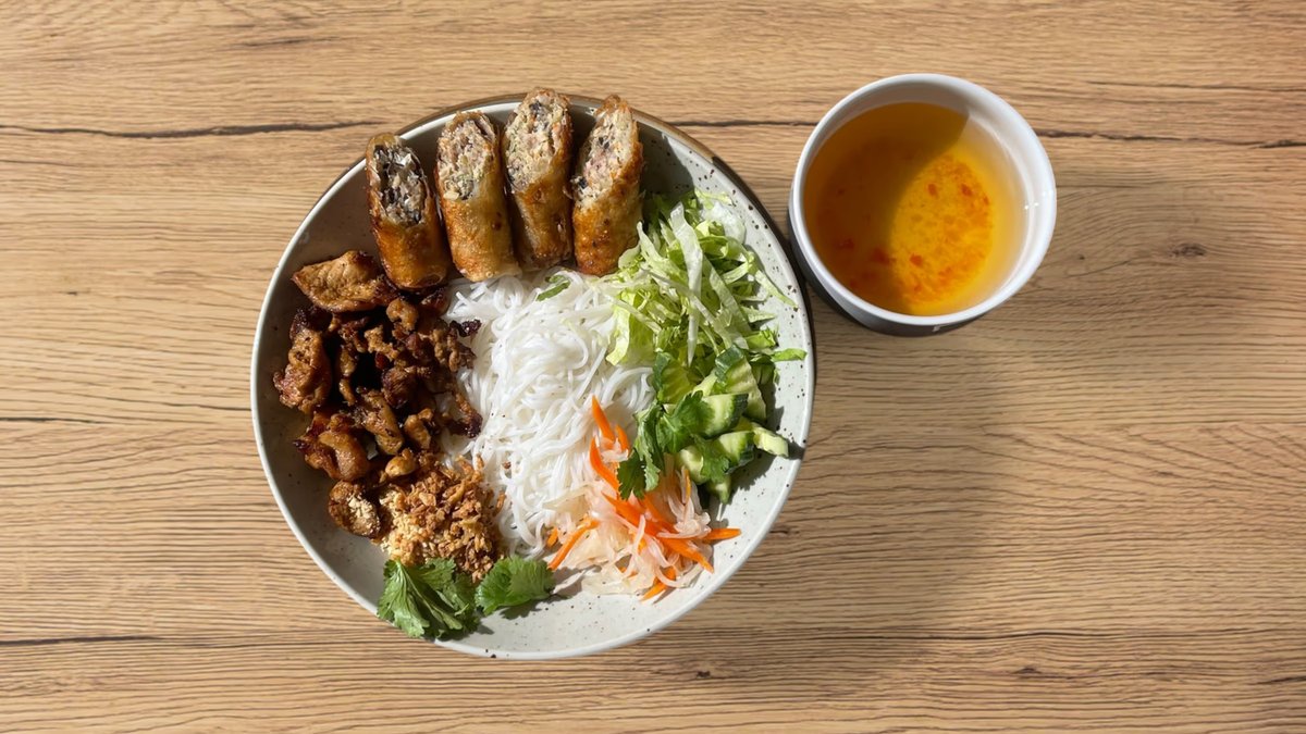 Těstoviny (bún), grilované maso (chả), smažené jarní závitky (nem), podávané s čerstvou zeleninou a domácí omáčkou.