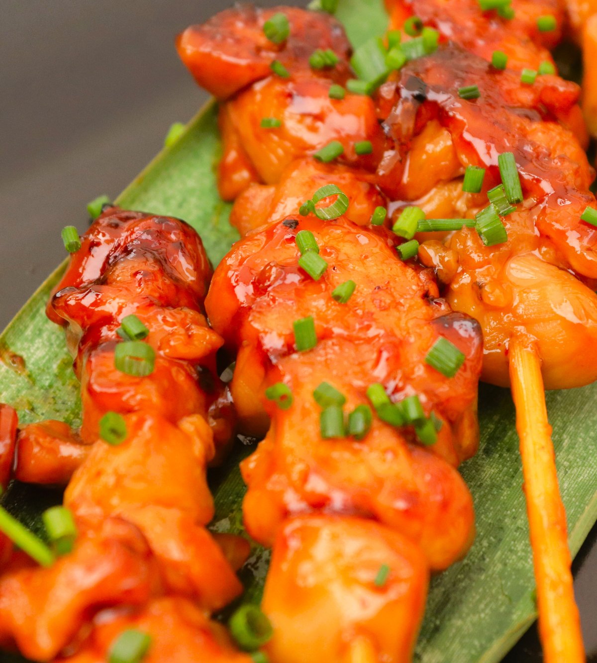 Šťavnaté kuřecí špízy grilované na japonský způsob, marinované a pečené na dřevěném uhlí. Podává se s tradiční sladko-slanou omáčkou tare.