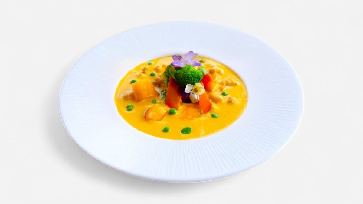Jemně pikantní červené kari z kokosového mléka zeleninou a kuřecím masem podáváme s jasmínovou rýží