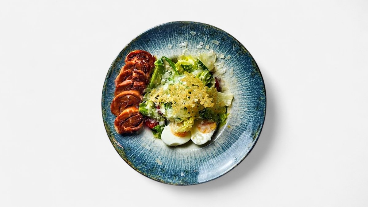 Lettuce mix, chicken fillet, parmesan chips, cherry tomatoes, chicken egg, caesar dressing