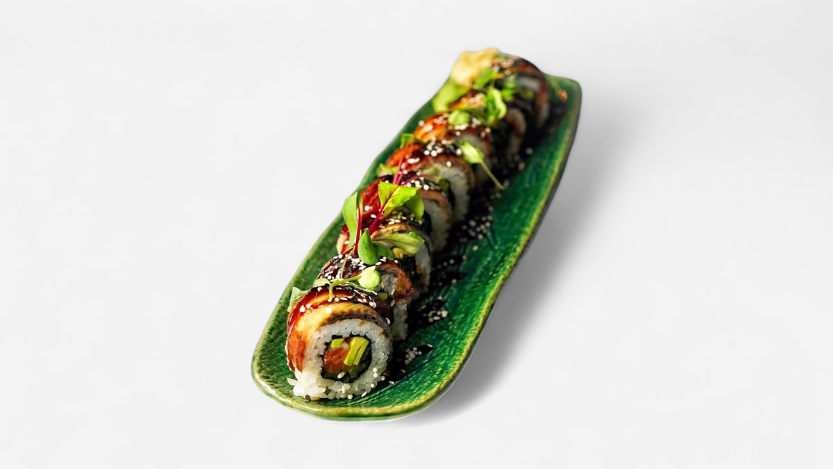 Eel, salmon, tobiko, avocado, cucumber, rice, nori seaweed