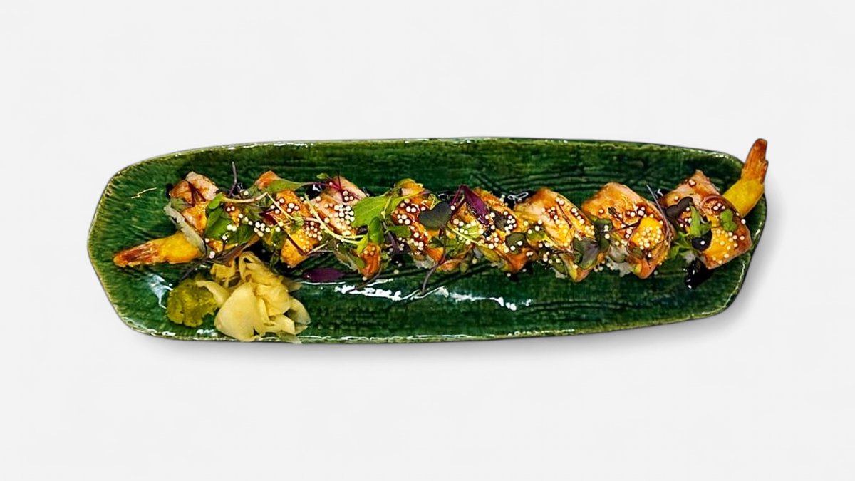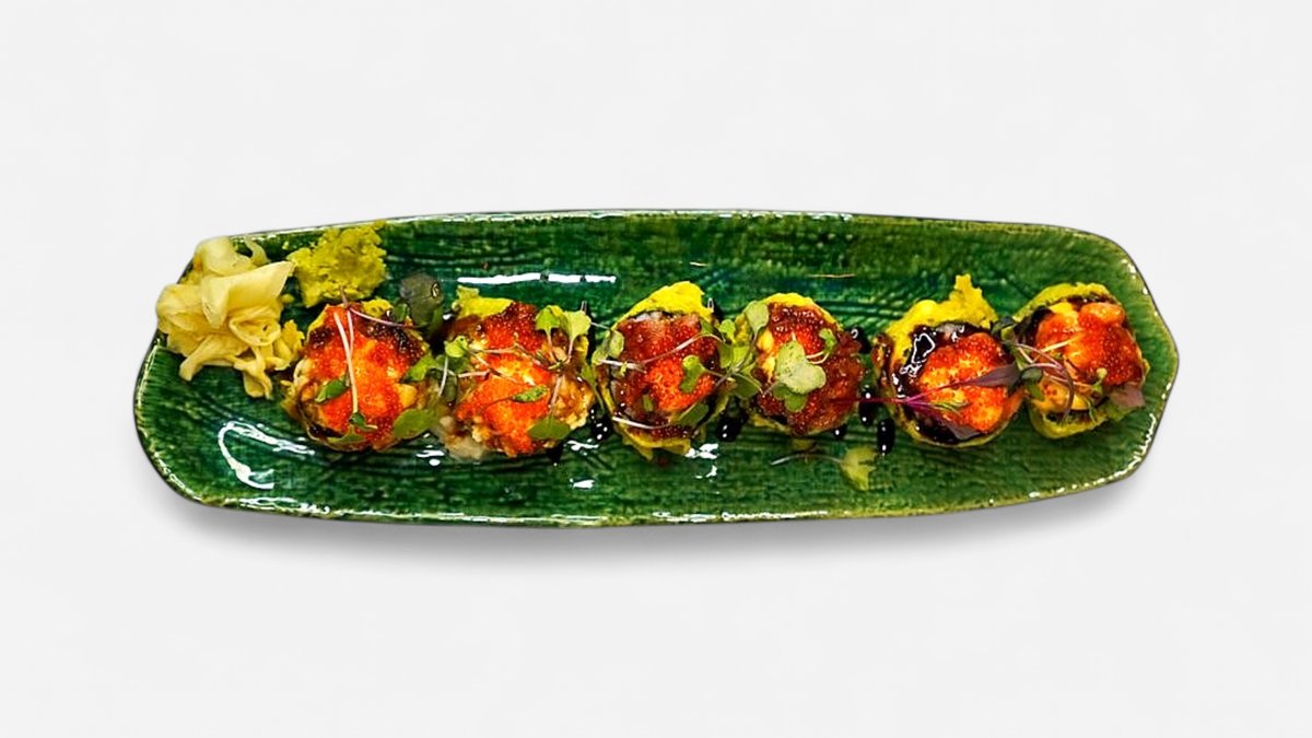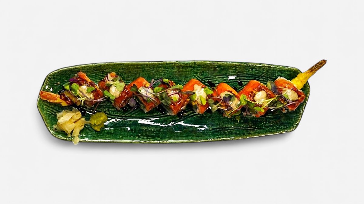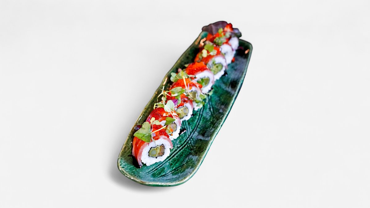 Salmon, soft-shell crab, aji amarillo, cucumber, tobiko caviar, rice, nori seaweed