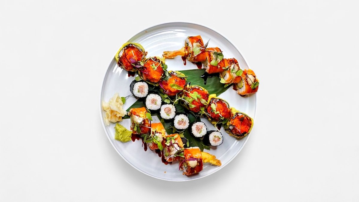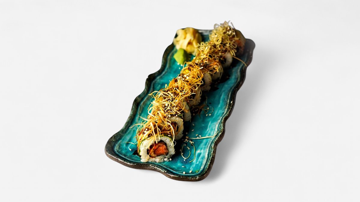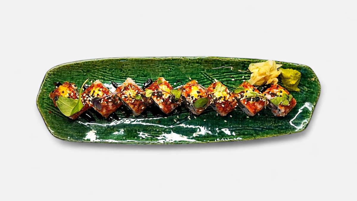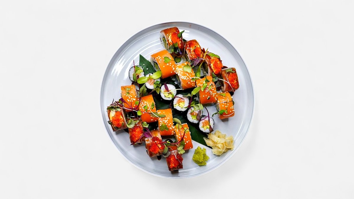 Salmon, soft-shell crab, aji amarillo, cucumber, tobiko caviar, rice, nori seaweed