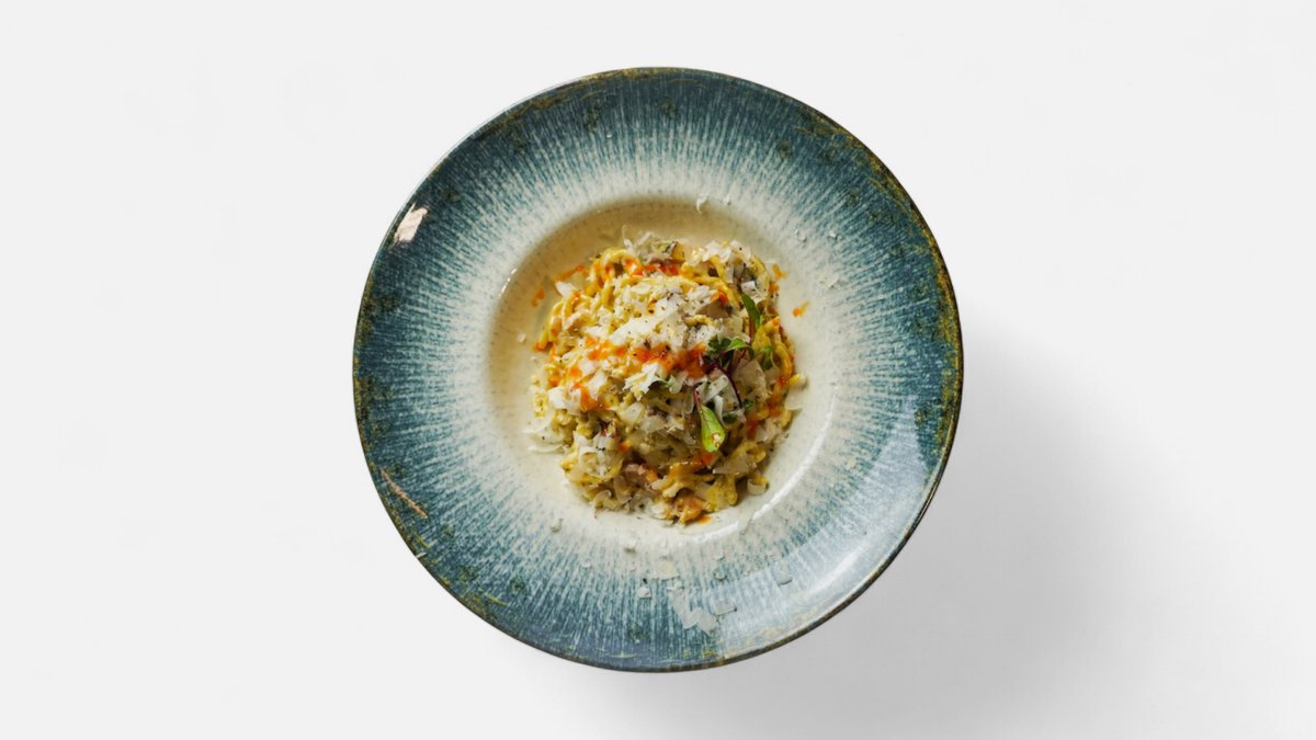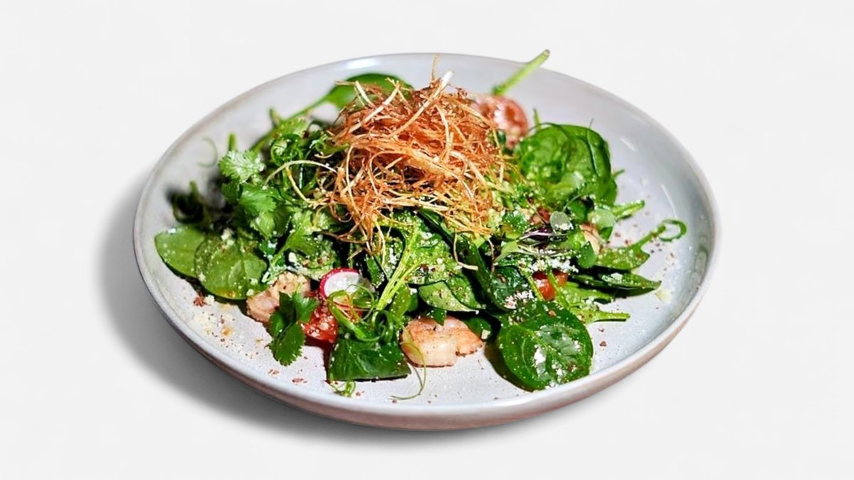 spinach, cherry tomatoes, shrimps, parmesan, leek, yuzu-truffle sauce