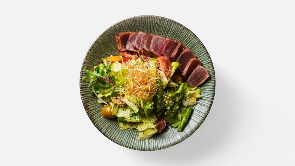 Lettuce mix, spinach, tuna, cherry tomatoes, thai sauce, chicken egg, raddish, soy sauce, sesame