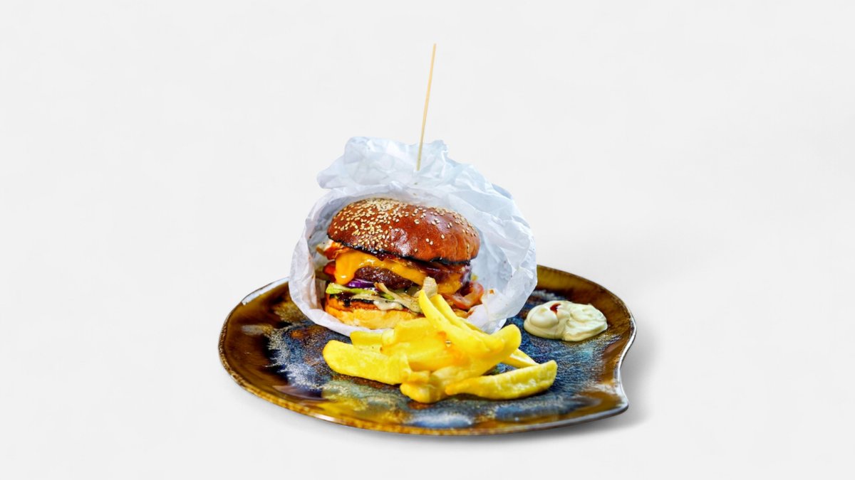 beef patty, tomatoes, lettuce mix, pickles, served with rustic fries