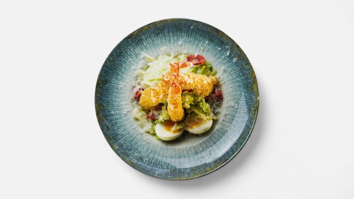 Lettuce mix, tempura shrimps, chicken egg, parmesan chips, cherry tomatoes, caesar dressing