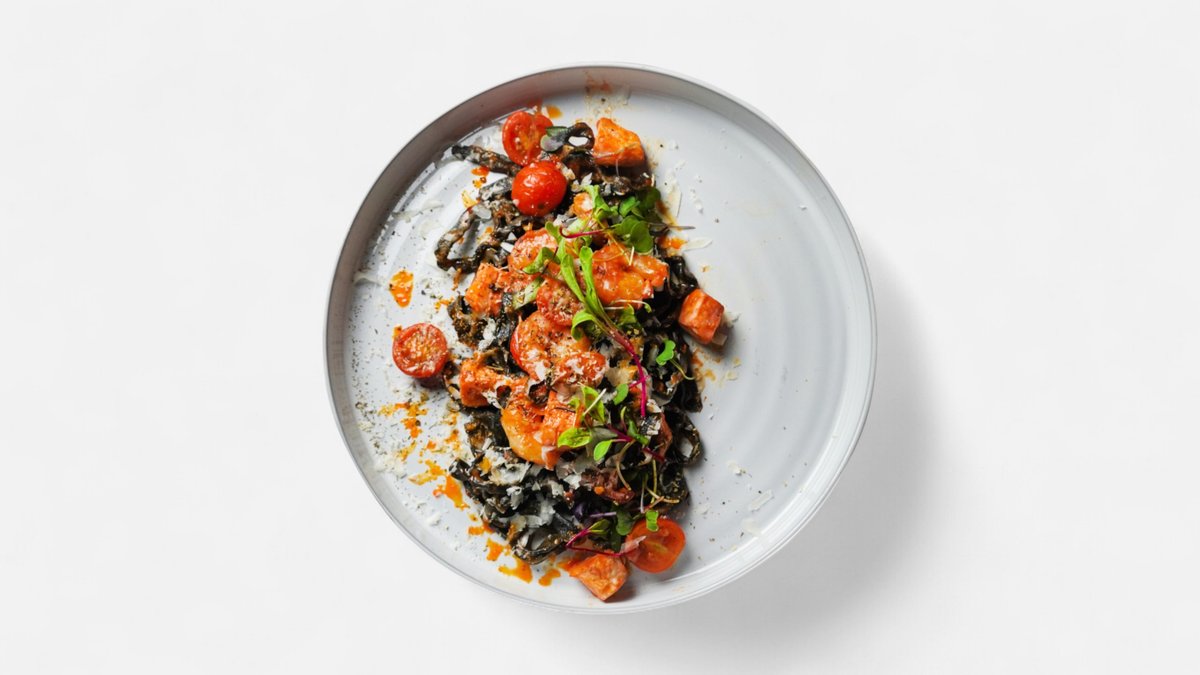 freschi pasta with squid ink, mussels, prawns, calamari, salmon filet, parmesan