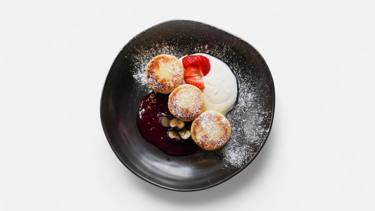 Cottage cheese syrniki served with sour cream, cowberry jam and berries