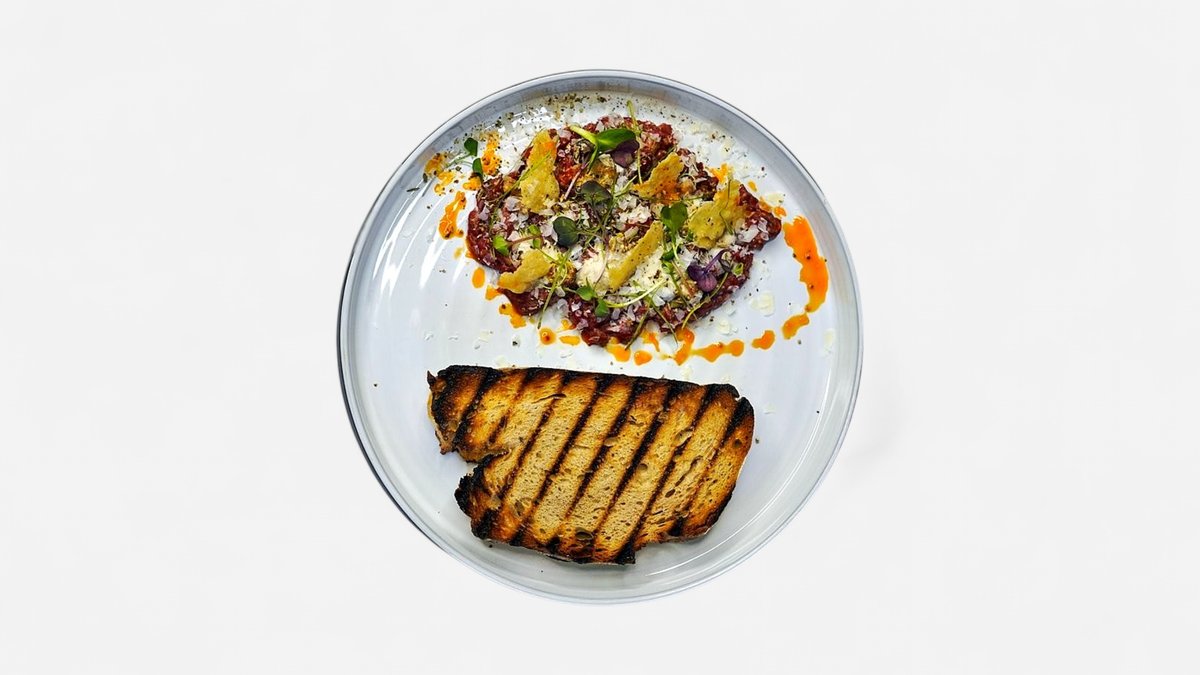 flank steak, tartine, truffle oil, parmesan chips, red onion, pickles.