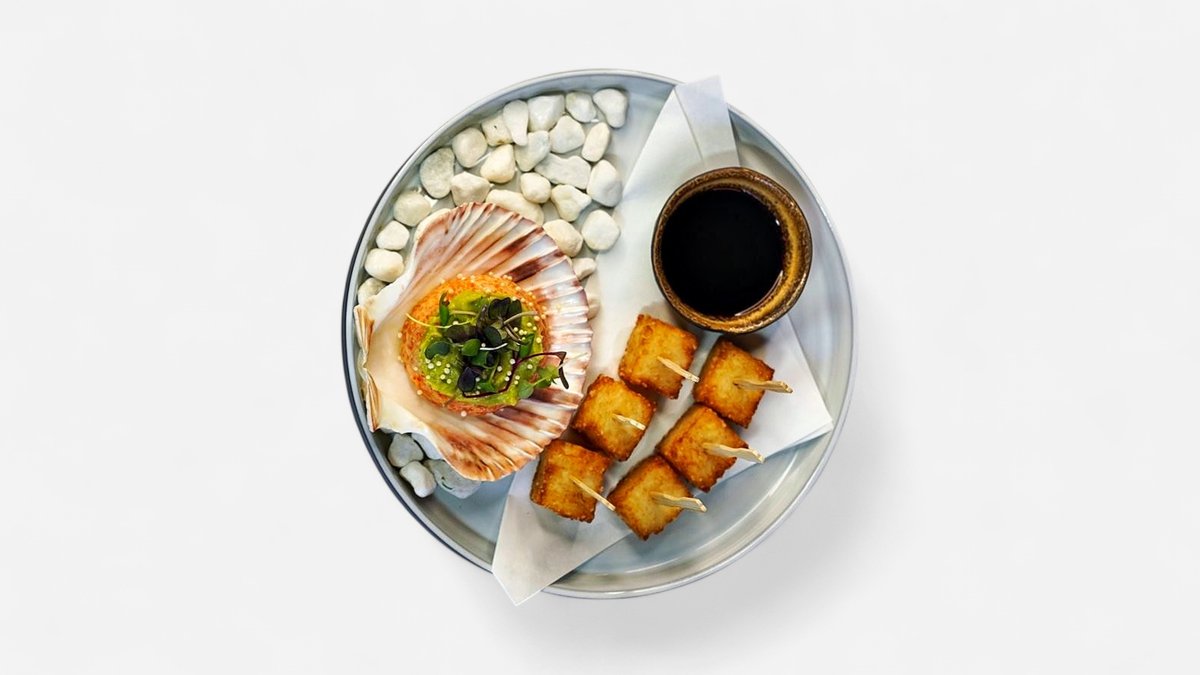 Salmon, tuna, scallop, tobiko caviar, cream cheese, spicy sauce, spring onions, rice, nori seaweed