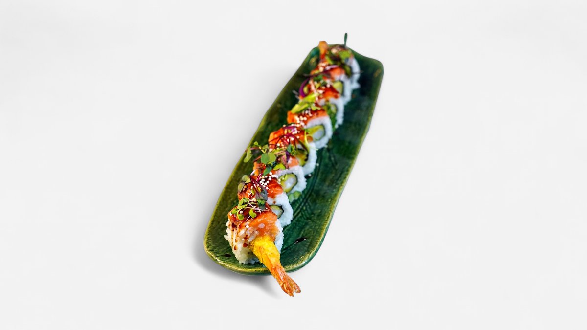 Salmon, tempura prawns, avocado, spicy sauce, rice, nori seaweed