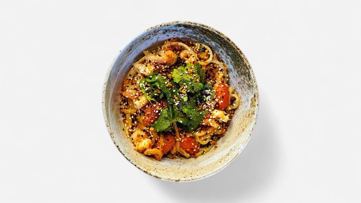 Udon noodles, shrimps, tom yum pasta, coconut cream, cherry tomatoes, peanuts, coriander, garlic