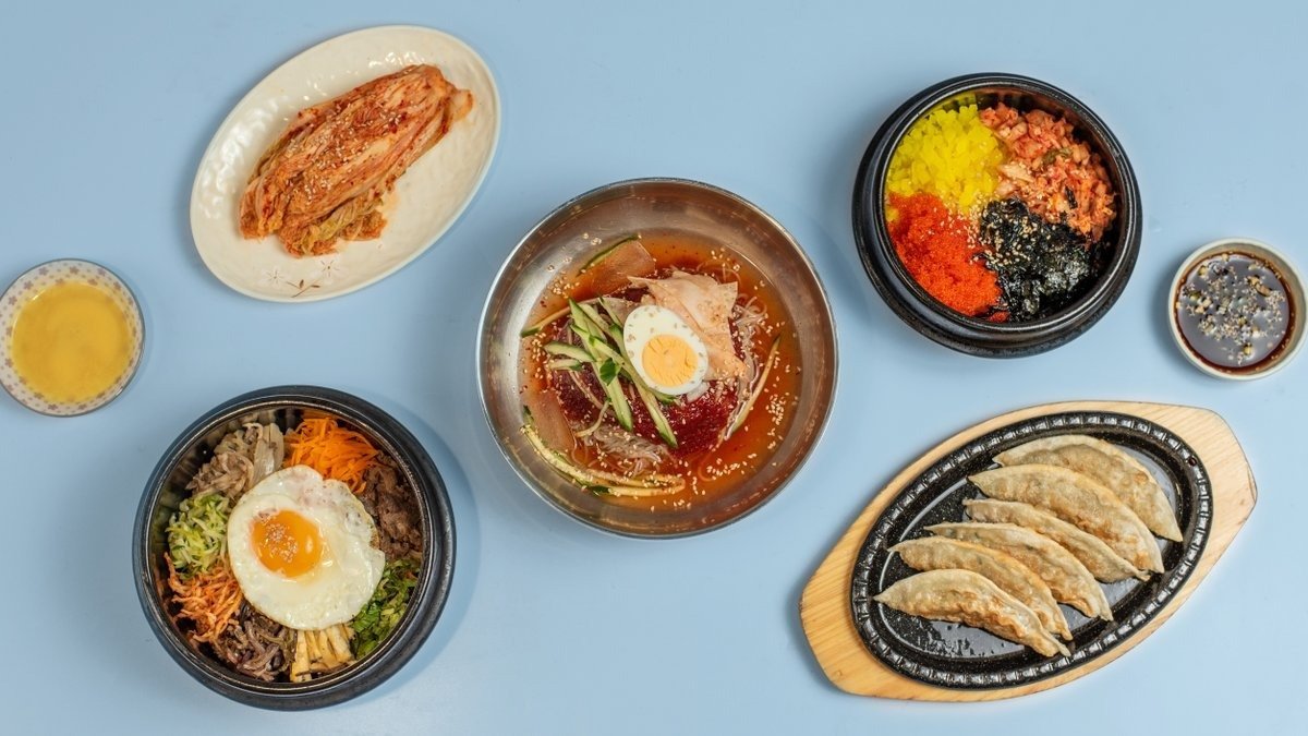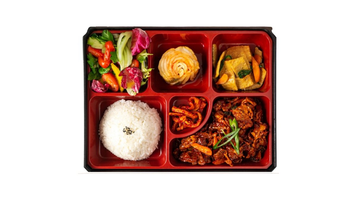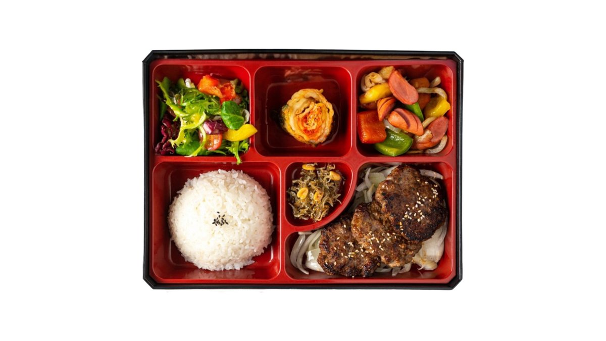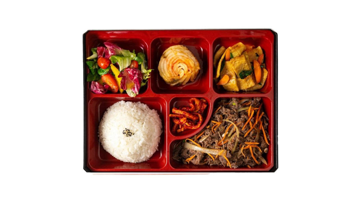 Hovězí maso marinované v bulgogi sójové omáčce, salát, přílohy a rýže. Přílohy se mohou lišit každý den. Marinated beef in bulgogi soy sauce, vegetable salad, side dishes, and rice. Side dishes may change every day.