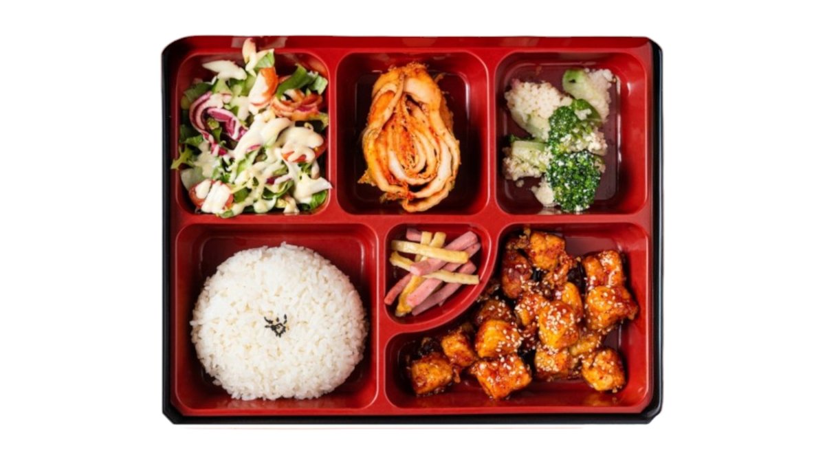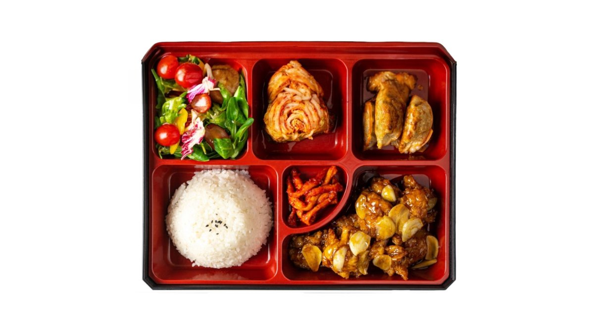 Smažené kuřecí kousky v jemné sójové omáčce, salát, přílohy a rýže. Přílohy se mohou lišit každý den. Fried chicken with sweet soy sauce, vegetable salad, side dishes, and rice. Side dishes may change every day.