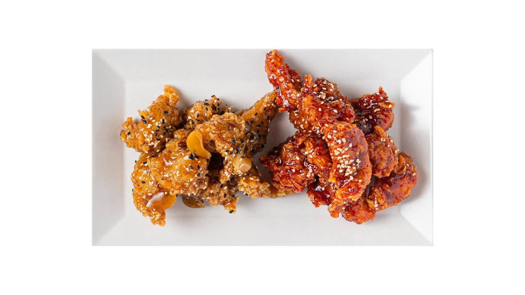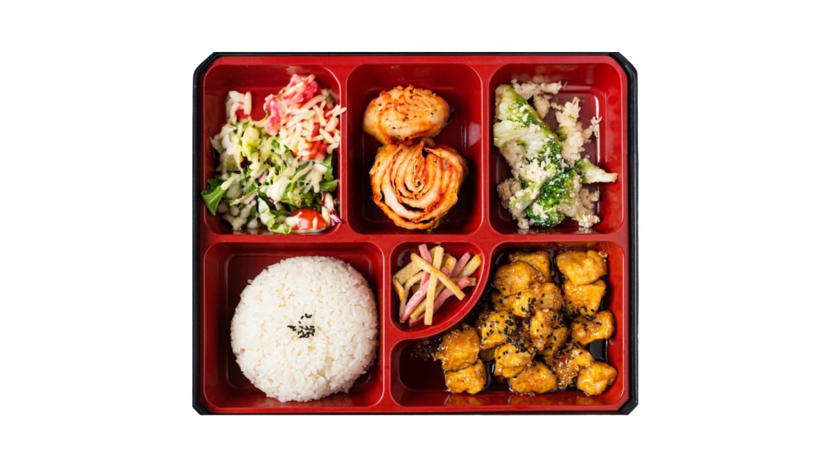 Smažené kuřecí kousky ve sladké čili omáčce, salát, přílohy a rýže. Pálivé. Přílohy se mohou lišit každý den. Fried chicken with sweet chilli sauce, vegetable salad, side dishes, and rice. Spicy. Side dishes may change every day.