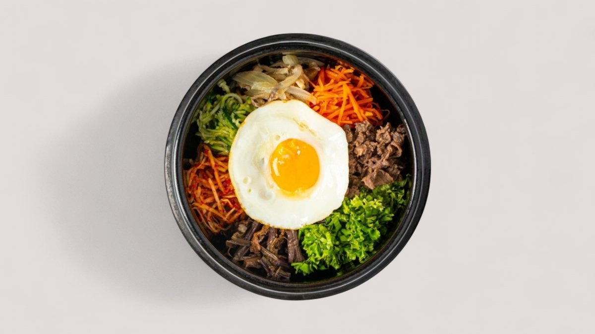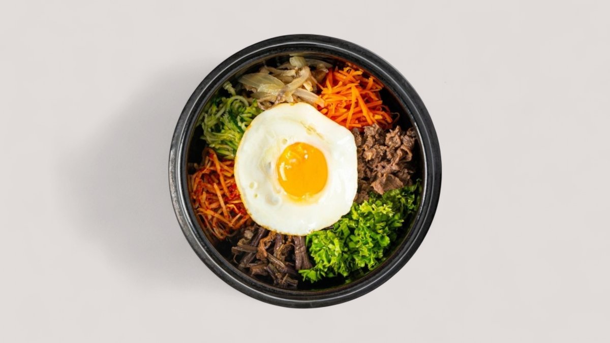Korean traditional dish with rice, cooked and fried veggies, egg, and marinated beef (Spicy sauce is provided separately.)