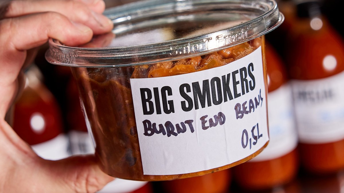 NA MÁSLE OPEČENÝ ROHLÍK, ANDOUILLE KLOBÁSA, MASOVÉ FAZOLE, HOŘČICE, NAKLÁDANÉ OKURKY, CIBULE.