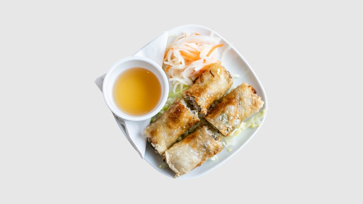 Smažené závitky s vepřovým masem, zeleninou, nudlemi a rybí sladkokyselou zálivkou.