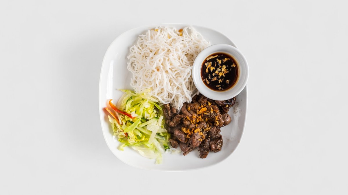 Tradiční vietnamské jídlo z grilovaného vepřového masa podávaného s rýžovými nudlemi, čerstvými bylinkami a sladkokyselou omáčko