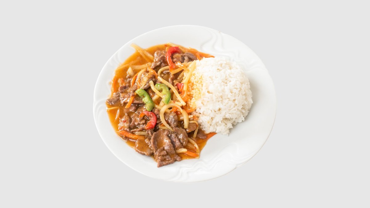 Restované hovězí s omačkou a zeleninou podávané s rýží