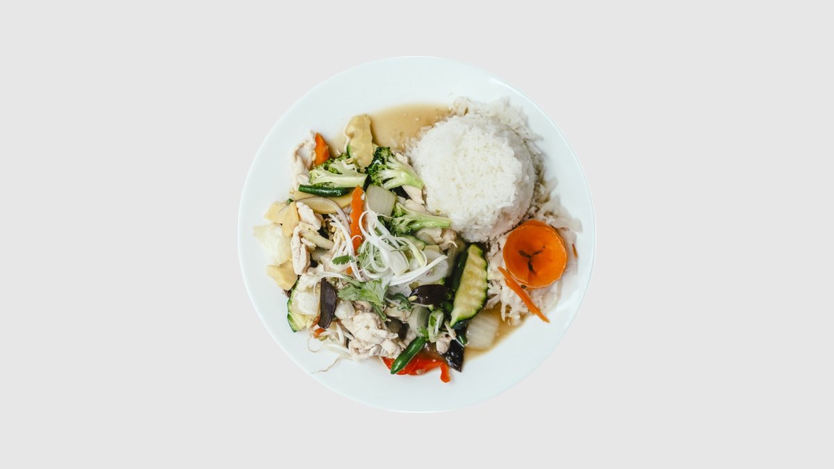 Restované kuřecí s omáčkou a zeleninou podávané s rýží.