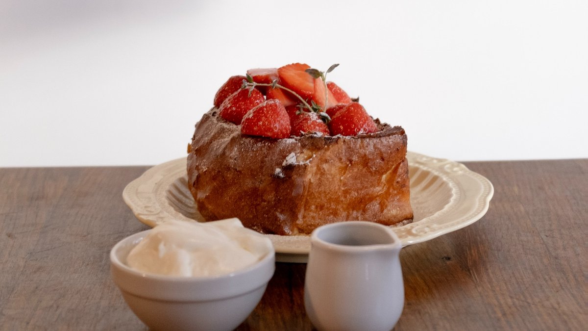 Milk bread, egg, milk, sugar powder, strawberries, cream [1,3,7]