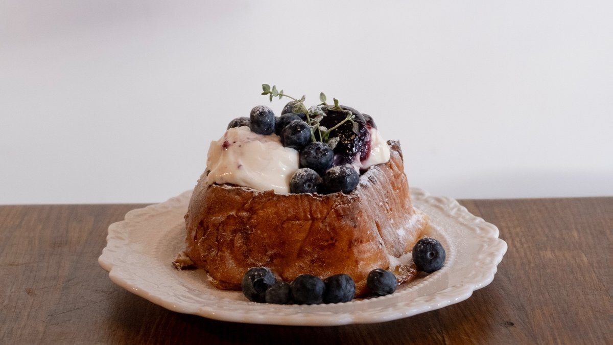 Milk bread, egg, milk, cream cheese, blueberries, blueberry jam [1,3,7]