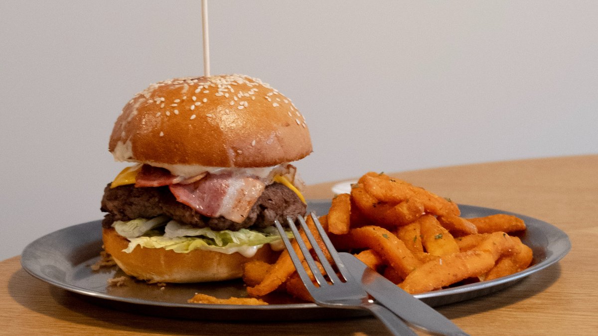 House-baked bun, cucumber, fresh Little Gem, perfectly mixed patty, melted cheddar, crispy bacon, dried onion, and our homemade classic sauce. Served with sweet potato fries !