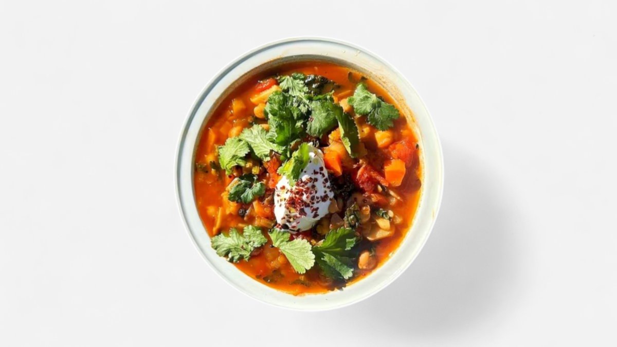 Marocká harira, cizrna, rajčata, červená čočka, jogurt, koriandr, chilli
