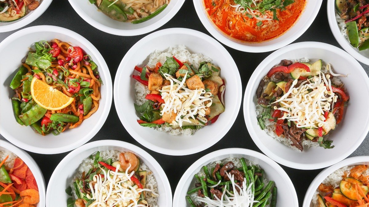 jídlo se zeleninou (červená cibule, červená paprika, cuketa) a sladkou sójovou omáčkou s thajskou bazalkou - sladká chuť v kombinaci s anýzovou chuťí bazalky - jídlo se podává s rýží a je zdobené sójovými klíčky, chilli je zvlášť v misce