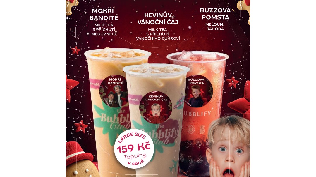 Krémový mléčný bubble tea s chutí Vánoc a hebkým cheesefoamem – sladké pohlazení, které by si Kevin vychutnal při hlídání domu. Veselé, hřejivé a vánočně neodolatelné!