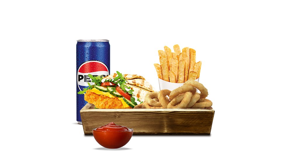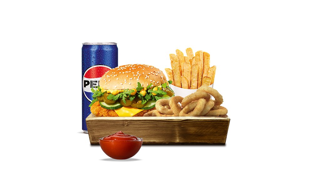 Může být burger křupavý a zároveň jemný? BURGER KING® to dokáže. Crispy Chicken má vše, co byste od vynikajícího kuřecího burgeru mohli čekat – nejlepší kuřecí maso v křupavém obalu, čerstvý salát a šťavnatá rajčata. Nepřekonatelné mistrovské dílo! Box obsahuje také střední hranolky a nápoj 0,33 litru, omáčku dle výběru a 9 cibulových kroužků. Alergeny a gramáže jsou uvedené u jednotlivých produktů v nabídce.