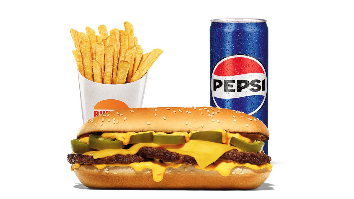 Tři plátky čerstvě grilovaného 100% hovězího masa s roztaveným sýrem čedar, ohnivou chilli omáčkou a pikantními jalapeños. V boxu s hranolkami, nápojem, cibulovými kroužky a omáčkou. Alergeny a gramáže jsou uvedené u jednotlivých produktů v nabídce.