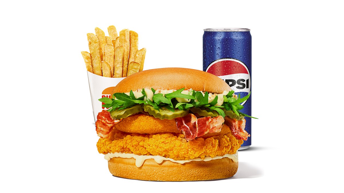 Pro opravdové gurmány – křupavé kuřecí, vejce, tři plátky slaniny, rajče, sýr, salát a veganská mayo v měkké briošce. V menu se středními hranolkami a 0,3l nápojem. Alergeny a gramáže jsou uvedené u jednotlivých produktů v nabídce.