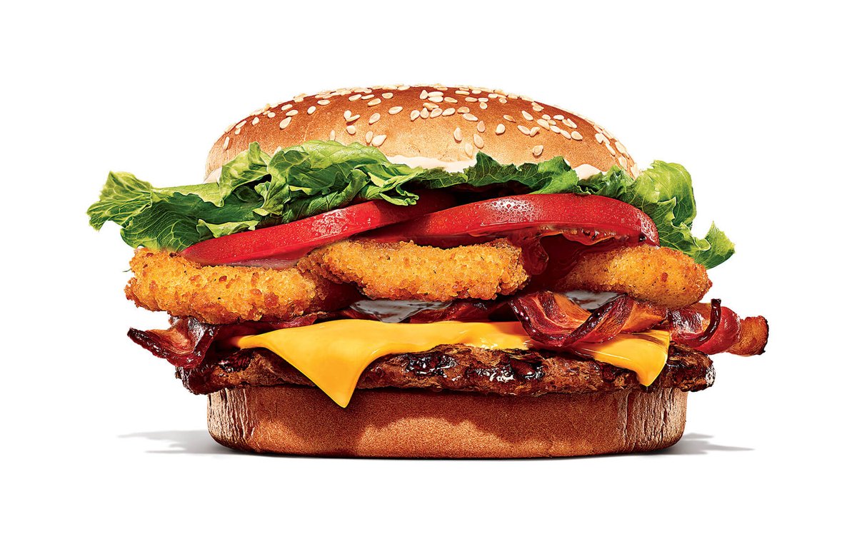 Texas WHOPPER®, to je náš legendární WHOPPER® burger se 100% na ohni grilovaným hovězím masem, šťavnatými rajčaty, čerstvým ledovým salátem, majonézou, nakládanými okurkami a cibulí navíc vylepšený o zlatavé cibulové kroužky, BBQ omáčku, slaninu a sýr čedar. Co víc si přát? Box obsahuje také střední hranolky a nápoj 0,33 litru, omáčku dle výběru a 9 cibulových kroužků.