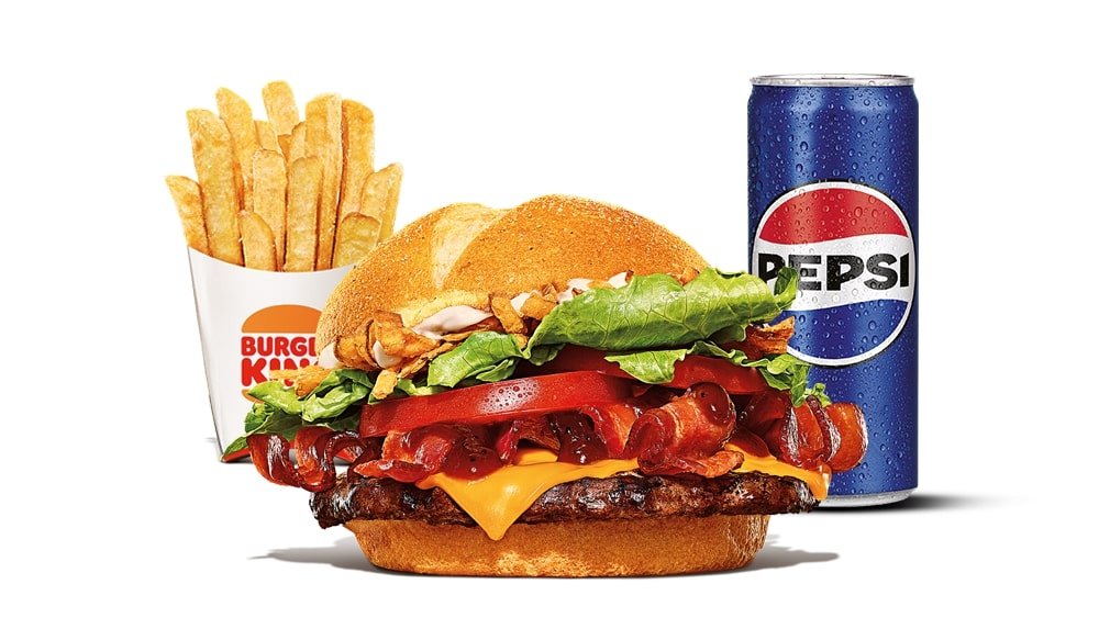 Pro opravdové gurmány – 150 g hovězího grilovaného na ohni, vejce, tři plátky slaniny, rajče, sýr, salát a veganská mayo v měkké briošce. V menu se středními hranolkami a 0,3l nápojem. Alergeny a gramáže jsou uvedené u jednotlivých produktů v nabídce.
