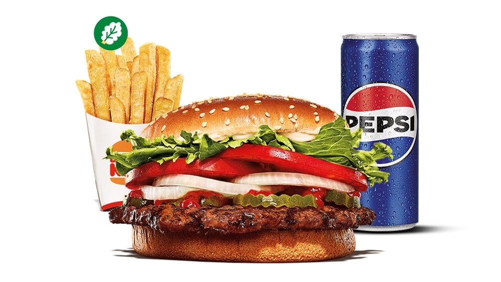 Náš legendární burger WHOPPER® se 100% na ohni grilovaným hovězím masem, šťavnatými rajčaty, čerstvým ledovým salátem, majonézou, nakládanými okurkami a cibulí – vše uložené ve zlaté housce sypané sezamem. Vždy čerstvý a připravený speciálně pro vás – tak, jak vám chutná nejvíc. Box obsahuje také střední hranolky a nápoj 0,33 litru, omáčku dle výběru a 9 cibulových kroužků. Alergeny a gramáže jsou uvedené u jednotlivých produktů v nabídce.